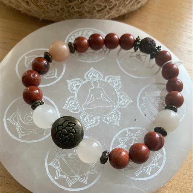 ✨ Un bracelet alliant la pierre de lune, pierre de la femme par excellence et le Jaspe rouge pierre du chakra Racine et Sacré.