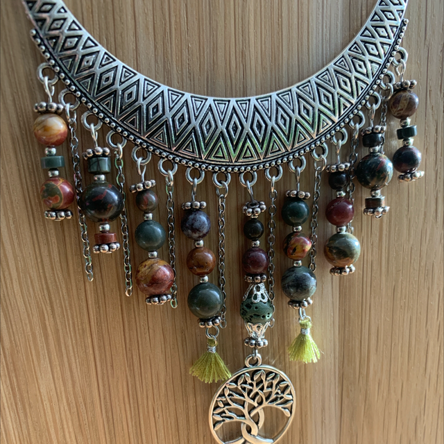 ✨ Le jaspe Picasso stimulerait la bonne irrigation des muscles et des organes. Pierre de créativité avec son arbre de vie, ce collier est le commencement des quelques chose…